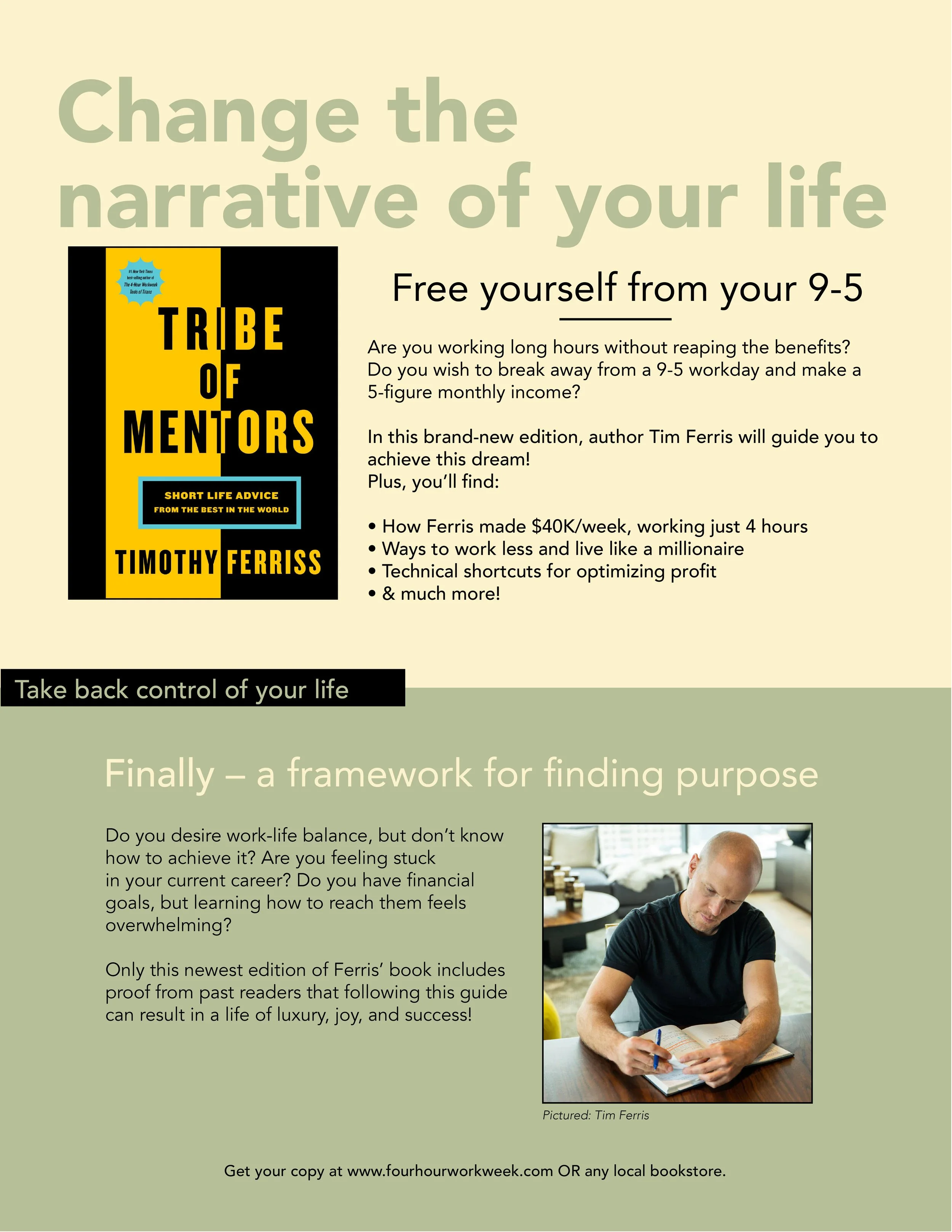 Project: Tim Ferris set out to sell copies of his previously-released book’s newest edition. He needed an ad that would inform readers about the release and boost book sales.